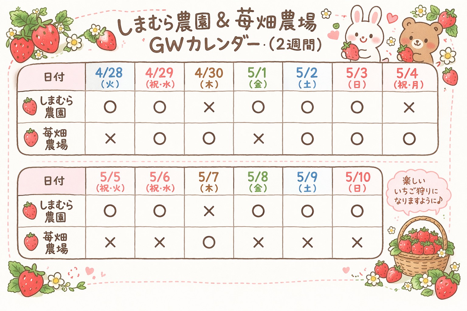 4月▶平日の開園は未定です。基本的に土日のみの開園となります。 ※本園の★しまむら農園★は4月の平日も開園しておりますので、ご希望のお客様はお問い合わせください。 5月▶GWとなりますので、下記カレンダー通りの開園となります。 ※必ずご予約をお願い致します!